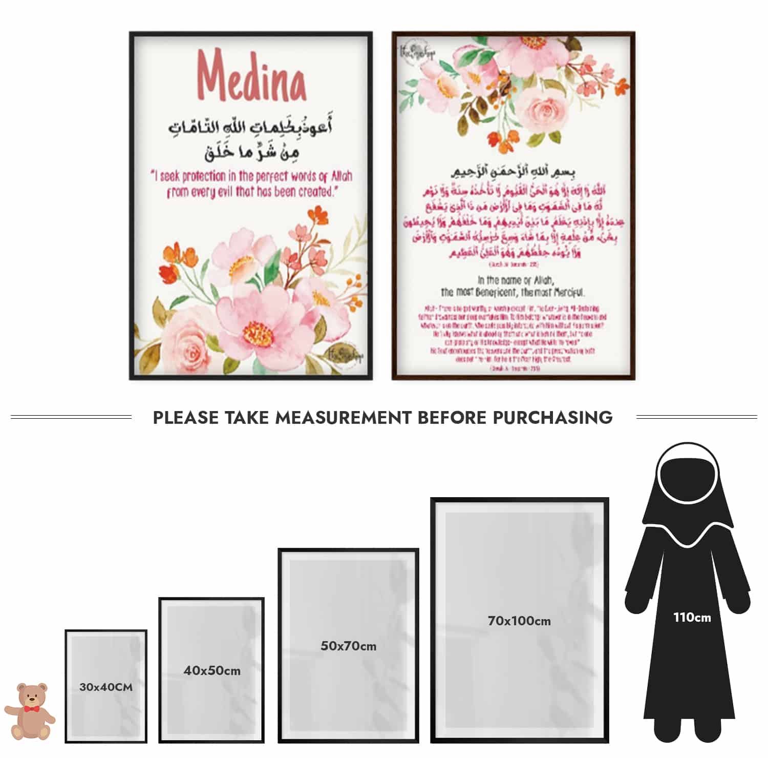 A joyful bouquet frames the supplication “I seek refuge in the perfect words of Allah from every evil He created.” Personalise it with your child’s name and let her drift to sleep feeling cherished and protected.